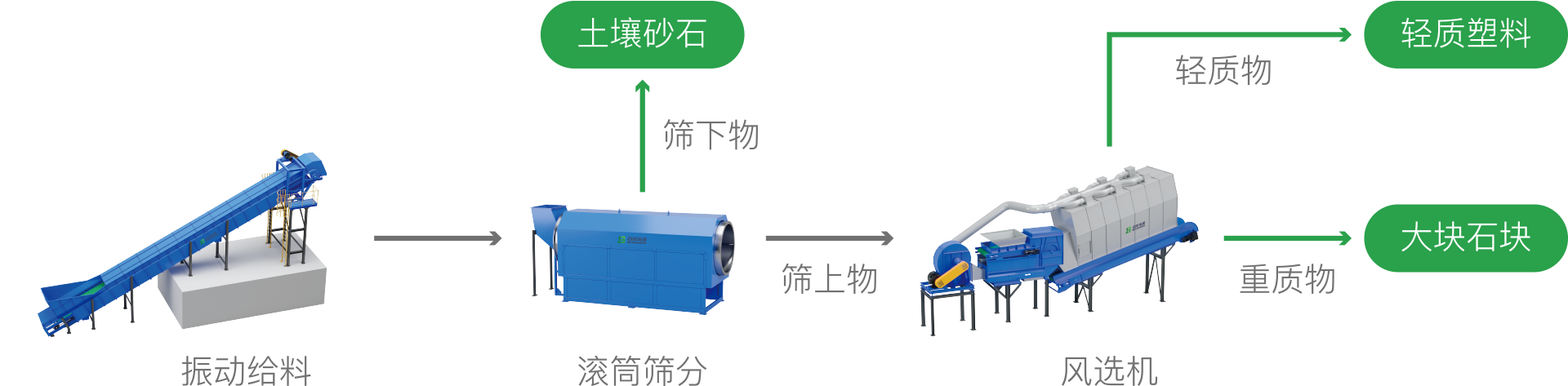 風選機利用再循環風機提供的空氣將垃圾分離成輕物質和重物質。重物質由于向上氣流不能支持其重力而降落到輸...